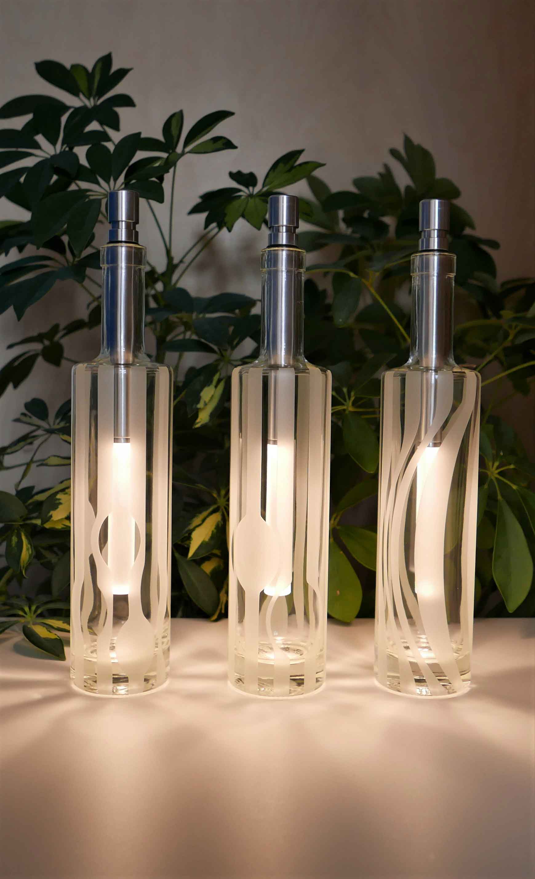 Unsere hochwertigen kabellosen Tischleuchten Outdoor werden bei uns im Set mit 9 Flaschen, 9 Flaschenlichtern und inklusive Batterien für den Erstbetrieb angeboten. Die handgefertigten sandgestrahlten dekorativen Flaschen erstrahlen in der Dunkelheit mit einem warmweißen und dimmbarem Licht. Die dekorativen Außenleuchten sind für eine einfache Handhabung batteriebetrieben. Setzen Sie mit den an jedem ebenen Platz im Außenbereich aufstellbaren Tischleuchten tolle und kreative Lichtakzente im modernen Stil-ganz ohne Strom und lästige Kabel. Die verwendeten hochwertigen LEDs haben laut Hersteller eine Lebensdauer von circa 100.000 Lichtstunden. Die kabellose Tischleuchte Outdoor aus unserer Leuchtenserie Casablanca besteht jeweils aus einer sandgestrahlten Glasflasche, der LED-Flaschenleuchte sowie den erforderlichen drei Batterien. Sie erhalten in diesem regenfesten Tischleuchten-Set drei verschiedene Flaschendesigns (3 x wellenförmig vertikale Linien, 3 x vertikal gerade Linien und 3 x mit leicht wellenförmigen vertikalen Linien). Die tollen Flaschenleuchten sind schnell und unkompliziert aufstellbar und erzeugen ein blendfreies und umlaufendes Licht. Die Lichthelligkeit beträgt je nach Einstellung 15 bis 40 Lumen pro Leuchte. Die Leuchtdauer beträgt circa 120 Stunden. Bei voller Lichtintensität beträgt die Leuchtdauer circa 35 Stunden. Hierbei spielt natürlich auch die Hochwertigkeit der Batterien eine Rolle. Wir empfehlen die Leuchtenserie Casablanca insbesondere als stilvolle Gastronomiebeleuchtung. Die Flaschenleuchten eignen sich aber ebenso perfekt als individuelle Tischbeleuchtung, Partybeleuchtung oder auch für Campingfreunde. Die stimmungsvolle Beleuchtung eignet sich stilvoll für Bars oder andere Outdoor-Events und Locations.