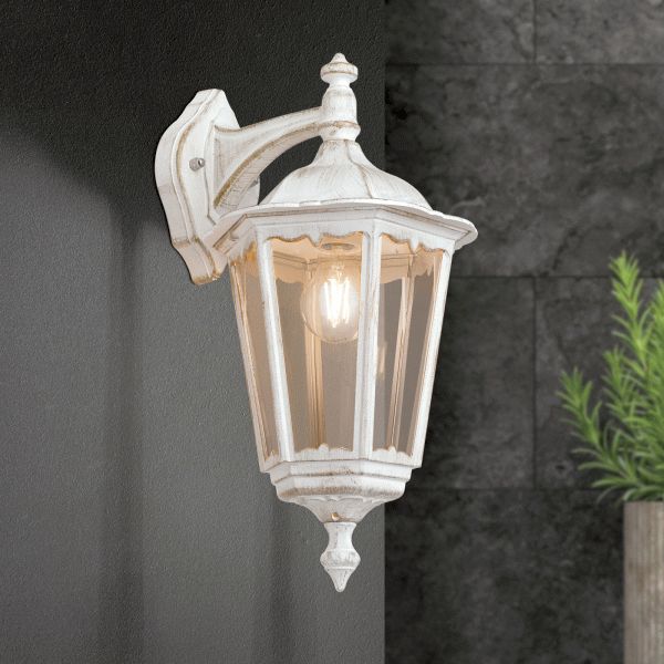 Die weiß-goldene Wandlaterne klassisch eignet sich als stilvolle Außenbeleuchtung im Hauseingang, als dekorative Terrassenbeleuchtung oder auch als klassische Wandleuchte an Nebengelassen wie Schuppen oder Carport/Garage. Die solide Außenwandleuchte passt vom Design unter anderem optisch sehr gut zu weiß geklinkerten Häusern und einem klassischen Baustil. Das besondere Flair entsteht bei der nostalgischen Außenleuchte durch die Verbindung der klassischen Farben Weiß und Gold. Die abwärts gerichtete Wandlaterne ist von ihren Maßen 45 cm hoch, 22 cm breit und 28 cm tief. Die Außenwandleuchte hat ein Eigengewicht von 2,3 kg. Die stilvolle Außenbeleuchtung Graz wird aus Siluminguss hergestellt, einer besonders widerstandsfähigen Aluminiumgusslegierung aus Aluguss in Verbindung mit Silicium. Silicium wird z.B. aufgrund seiner guten Materialeigenschaften auch im Flugzeugbau verwendet. Die Laternen-Fenstereinsätze werden aus aus Rauchglas gefertigt. Rauchglas erfreute sich bereits in den 60-iger Jahren großer Beliebtheit und war in der Beleuchtung innen als außen voll im Trend.