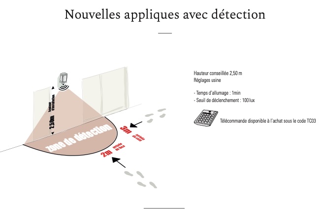 Die stilvolle Wandleuchte verfügt am unteren Ende der Leuchte über einen integrierten Bewegungsmelder. Die ebenso klassisch wie moderne Wandleuchte verfügt am unteren Ende der Leuchte über einen integrierten Bewegungsmelder. Ab Werk wird der Bewegungsmelder vorprogrammiert geliefert, wie auf dem anhängenden Foto dargestellt ( 3 Meter Breite und 2 Meter nach vorn ab Leuchte). Sollte Ihnen eine andere Reichweite besser gefallen, erfolgt eine individuelle Einstellung des Bewegungsmelders über die mitgelieferte Fernbedienung (siehe Bild). Die Leuchtdauer beträgt 1 Minute. Der Hersteller empfiehlt eine Montage in Höhe von etwa 2,50 Metern.