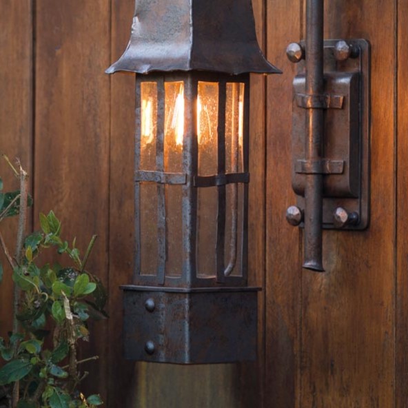 Die außergewöhnliche Außenwandleuchte Torre ist ein absoluter Blickfang für jeden Hauseingang, die Veranda oder die Terrasse. Die Kombination aus robustem Schmiedeeisen und antikem Echtglas schafft eine warme und einladende Atmosphäre, die Ihre Abende im Freien noch schöner macht. Die Außenleuchte im Turmdesign wird aus feuerverzinktem Stahl in echter Handarbeit fachmännisch hergestellt. Detailreich mit viel Kreativität zeigt sich diese außergewöhnliche Außenwandleuchte, ein echtes Kunsthandwerk, hergestellt in einer deutschen Leuchtenmanufaktur. Der massive schmiedeeiserne Wandarm ist ein geschwungener Stab, der am oberen Ende die ebenso hohe wie längliche Leuchte trägt. Die vielen kleinen Fenstereinsätze bestehen aus Echtglas. Das Glas antik zeigt dabei tropfenähnliche Strukturen im Glas. Bei dieser Leuchte scheint das Licht aus vier Seiten durch schmiedeeiserne Sprossenfenster heraus und zusätzlich erfolgt aus dem unteren Boden der Wandleuchte ein Lichtaustritt. Dies wird durch die Verarbeitung von 2 verschiedenen Lampenfassungen ermöglicht. Neben einer E27-Fassung wird zusätzlich eine GU 10-Lampenfassung verarbeitet. Wir empfehlen als Lichtfarbe warmweißes bis gelbliches Licht (2500 bis 3200 Kelvin), um die anheimelnde Außenwirkung dieser außergewöhnlichen Außenwandleuchte nochmal zu unterstreichen. Hierbei gilt die Regel, desto höher die Kelvinzahl, desto heller, aber auch kälter ist das Licht. Leuchtmittel sind bei der Lieferung nicht enthalten. Die exklusive Wandlampe außen hat eine Höhe von 113,5 Zentimetern und eine Breite von 19,5 Zentimetern. Der Wandabstand beträgt 35 cm. Die massive Wandbefestigung ist 28,3 cm hoch und 14,6 cm breit. Die außergewöhnliche Außenwandleuchte Torre besticht mit der authentischen Oberfläche im Vintage-Look im klassisch antiken Design. Die originelle Gartenleuchte gibt es auch in weiteren Finishes wie Eisen natur, Taverna, schwarz, schwarz-silber, Patina, Alt-Kupfer, Alt-Bronze, grün-antik und Steampunk. Die exklusive Wandleuchte hat ein Eigengewicht von beachtlichen 16 kg. Schauen Sie doch als Inspiration mal nach unserer ebenso außergewöhnlichen Gartenleuchte 3 mit 3 dekorativen Lichtkelchen im Tulpenmotiv.